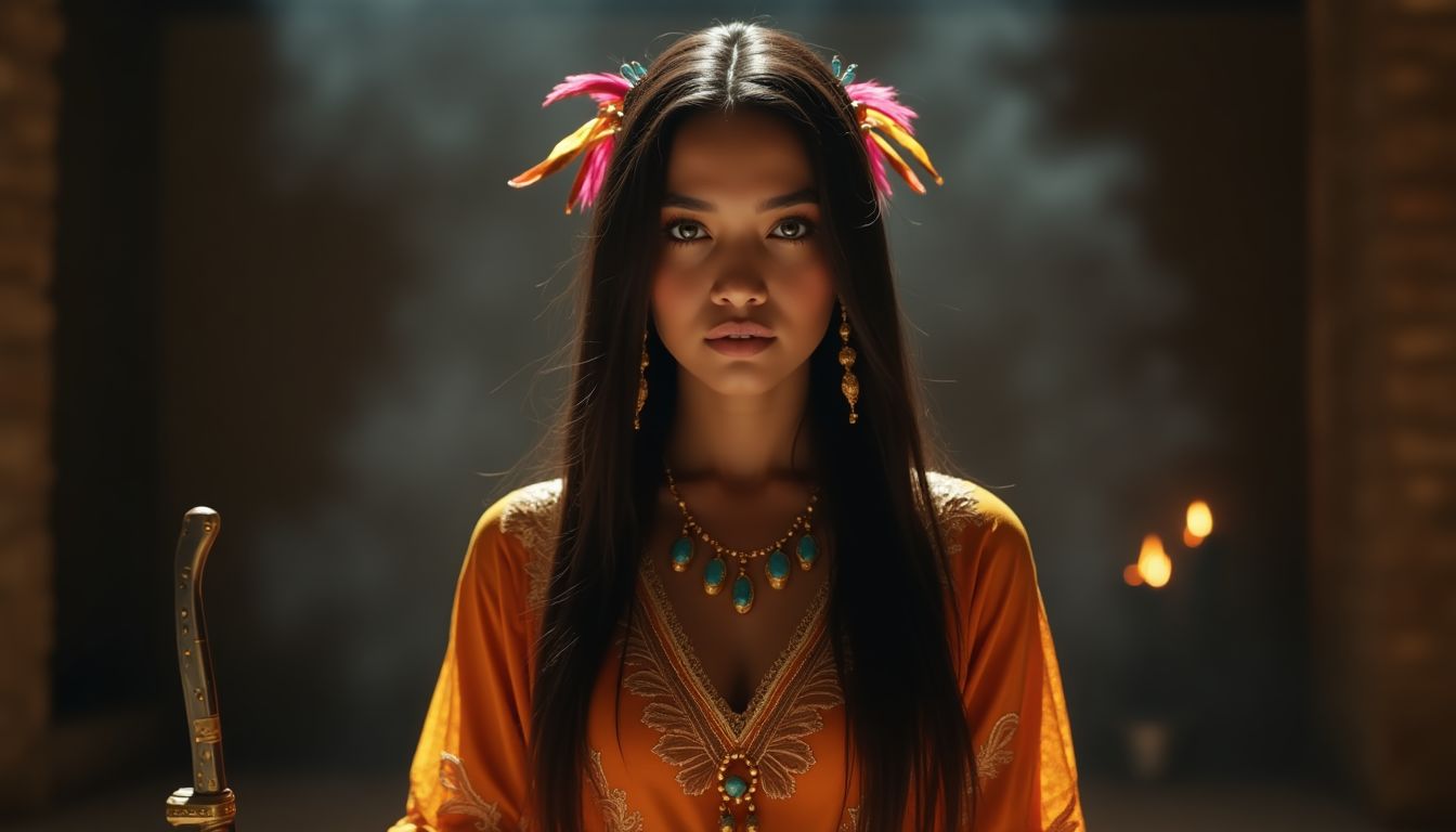 The year was 1498. Deep within the golden lands of the Aztec Empire, under the shadow of the grand Templo Mayor, a young noblewoman named Xochitl walked with an air of grace and quiet authority. She was a vision of beauty, her luminous blue eyes like twin fragments of the heavens, a rare and almost mystical trait among her people. Her long, dark hair shimmered in the sunlight, adorned with tiny gold beads and vibrant feathers, swaying gently with every step she took. Xochitl’s attire reflected her high status; she wore a flowing huipil dyed in a rich palette of orange, its intricate patterns woven with golden threads, as though it had captured the essence of the sunset. The fabric hugged her figure with elegance, while the lace-like designs at the edges spoke of divine artistry. Her golden sandals, studded with obsidian gems that mirrored the dark deep of the underworld, tapped softly against the stone-paved avenues of Tenochtitlan.