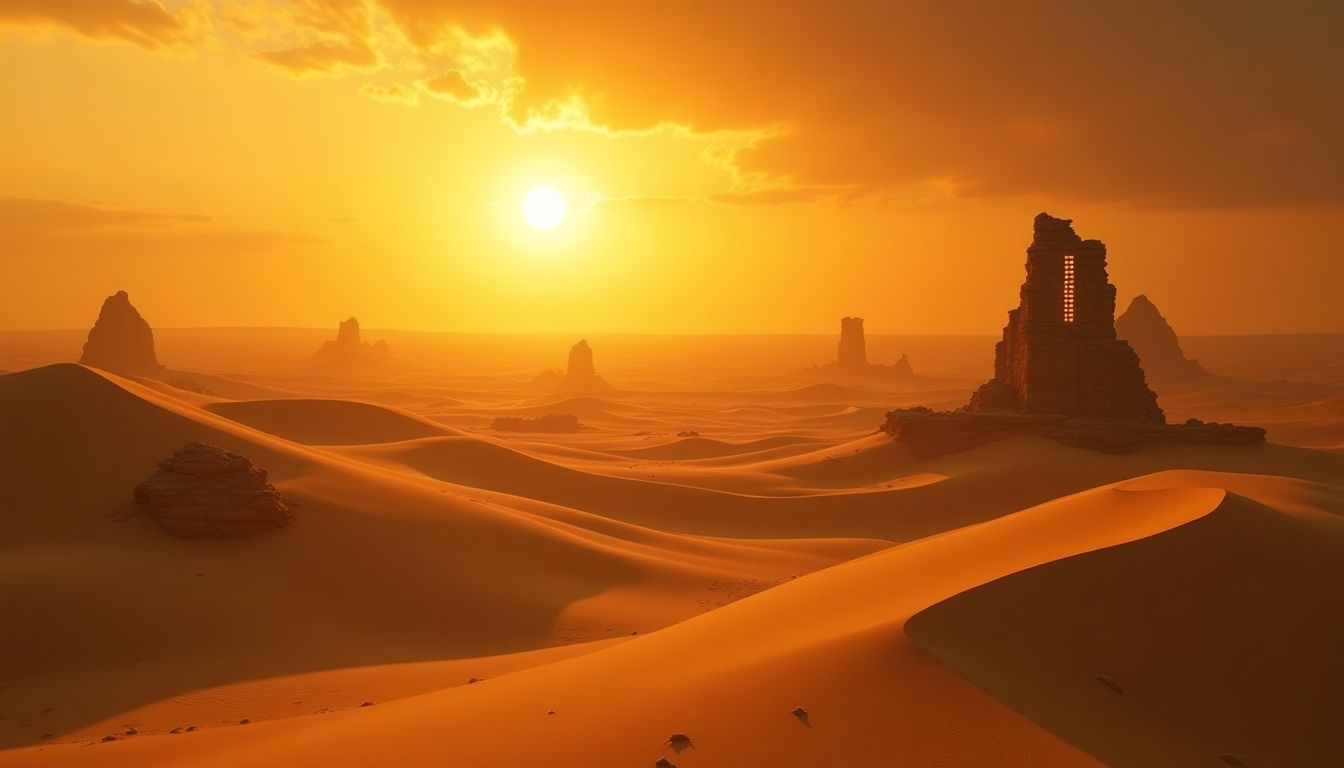 Serina ran across the high dunes, the sound of her sandals crunching beneath her feet. Her breath came quick, adrenaline coursing through her veins as she traced the faint whispers of the wind—a voice that had called her, as ancient as the stars. The desert, scorched by the harsh Atlantean sun, stretched endlessly around her, waves of golden sand rising and falling like the ocean it had once been. She clutched the relic closer to her chest, her fingers brushing the smooth surface of the golden artifact. She didn’t yet know its purpose, but deep in her soul, she knew it could change everything.