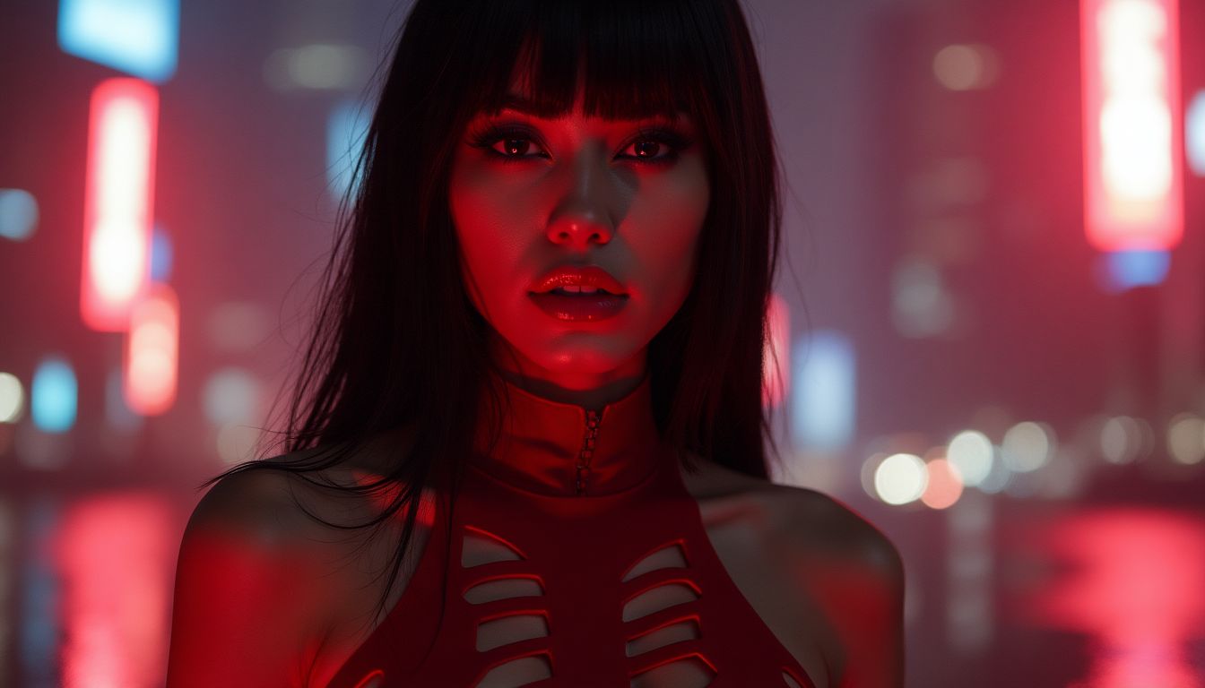 Luna slid her arms into the long-sleeved, asymmetrically cut crimson garment. The fabric clung close, sleek and pliant as if it were the skin of something alive. Her hands moved deftly over the intricate strappy designs, fastening her armor of defiance with measured care. The slivers of her pale skin exposed through the cutouts spoke of vulnerability, but the fiery red shouted defiance—a beacon against the dark plague of conformity imposed by Omnitech.