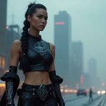 The sky shimmered like burnt metal as the airship glided across the floating city of Celestrum, a marvel of the 23rd century where gravity was merely a suggestion. Elena Voss, the city’s top courier, stood aboard the deck, clutching a shimmering orb glowing with encrypted data. Her attire was a fusion of the past and future—a fitted black bodice that resembled an ancient corset, its glossy surface catching the midday sun with a metallic sheen. The high neckline accentuated her poised frame, while supple black leather pants hugged her legs, ending in knee-high boots that sparkled with embedded circuitry.