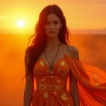 In a world where verdant steppes echoed with the cries of feathered beasts and stars glimmered like liquid sapphires against a tangible azure sky, a woman named Ayla stood motionless, embodying the unwavering spirit of resilience. She donned a flowing black gown reminiscent of a modern twist on ancient Greek attire, its fabric shimmering with deep emerald tones under the sunlit brilliance. The garment draped over her slender form with cascading layers that embraced her movement, contrasting with her waist-length dark hair that fluttered gently in the warm breeze. A substantial silver brooch shaped like a phoenix adorned one shoulder, a symbol of rebirth that reflected her tenacity.