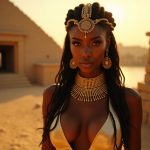 Her outfit was a marvel—an ensemble that captured the essence of Kemet’s blending traditions yet defied the mundane. A black-and-white gown of intricate zebra stripes hugged her form with careful precision, simultaneously provocative and regal. The fabric shimmered faintly, embedded with tiny obsidian and ivory beads that caught the golden light of the setting sun. Layers of gold and turquoise adorned her wrists and neckline, their craftsmanship hinting at the hand of a master artisan. A wide, gold collar—a symbol of her noble station—circled her neck, its surface etched with swirling depictions of the sun and stars. The hems of her dress flared slightly as she walked, rippling like the sands in a gentle breeze. Her sandals, laced with fine leather and inlaid with tiny lapis stones, barely made a sound as they touched the earth.
