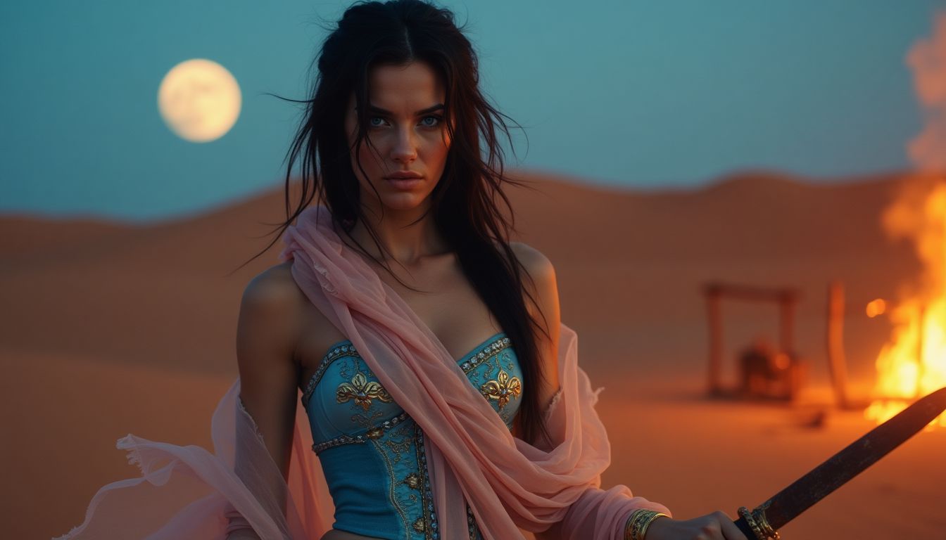Sahira ducked just in time, the blade grazing the delicate blue-and-pink silks that wrapped tightly around her slender frame. Her outfit, a flowing desert ensemble of translucent pink gauze layered over an intricately embroidered blue corset stitched with fine gold thread, was crafted for form rather than function. A foolish choice, she thought bitterly, as she fought to wrestle the dagger from the horde’s grip. Its color—a callback to her noble lineage—may yet place a target on her back. The lacework edges on the silk shimmered against her pale skin, ghostlike under the desert moon now flooding the chaos beyond the tent. But none of that mattered. She refused to die here, dressed for a charade she had planned to thwart.