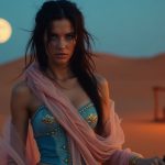 She glanced down at her own attire—a two-piece outfit reminiscent of her past life, but transformed by the design conventions of this new epoch. A flowing white bodice, akin to a swimsuit top, with delicate golden accents around the neckline, paired with a skirt of deep azure that danced lightly around her ankles. Accentuating her look, a beige headpiece resembling a modern cap crowned her long, dark waves of hair. But this cap bore the insignia of an ancient sun god, blending seamlessly into the world she had entered. Her heart raced with the thrill of the unknown, but curiosity quickly drowned out her trepidation.