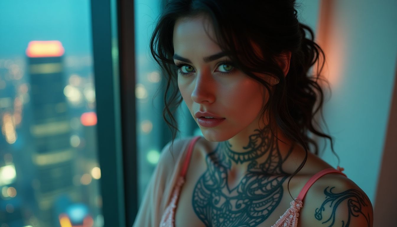 neon veins of Nueva Lumina pulsed with life. Her delicate lingerie still clung to her frame, though she’d thrown a loose kimono over