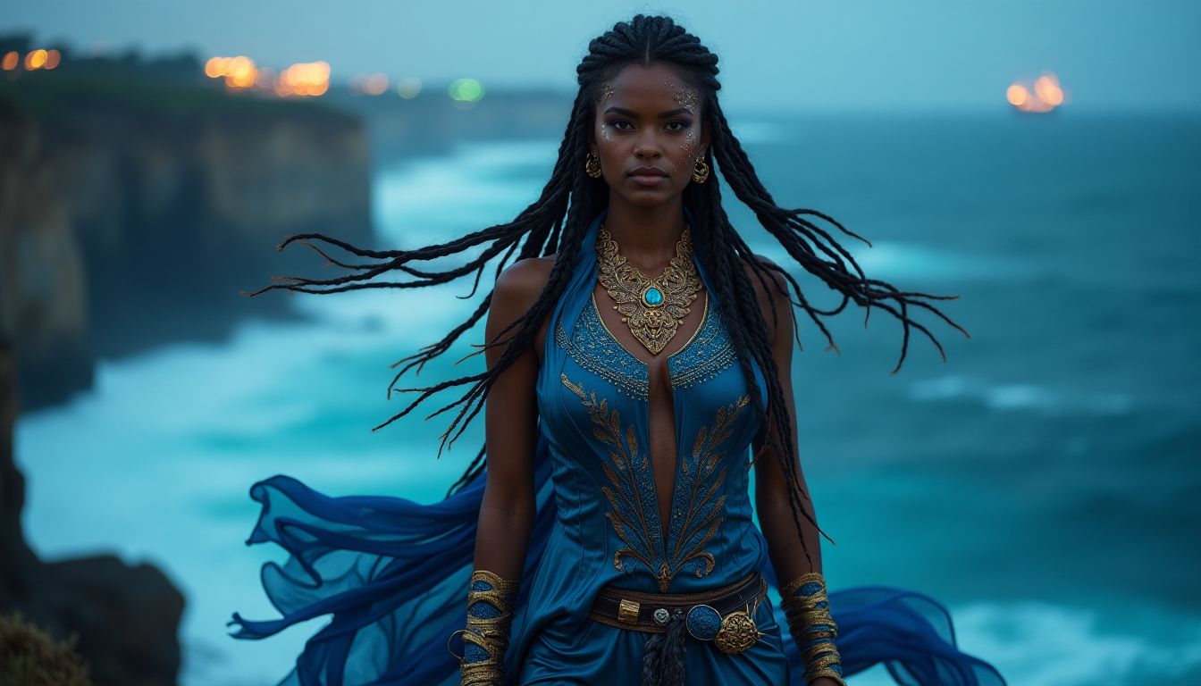 She stood atop the cliff, the sea wind tugging at her garments as if urging…